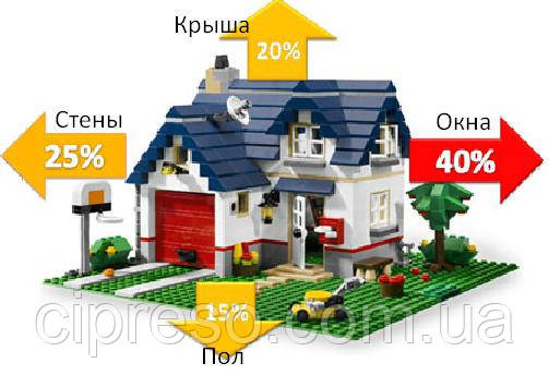 На наведеному нижче малюнку схематично зображені втрати тепла в будинку для нашої кліматичної зони.